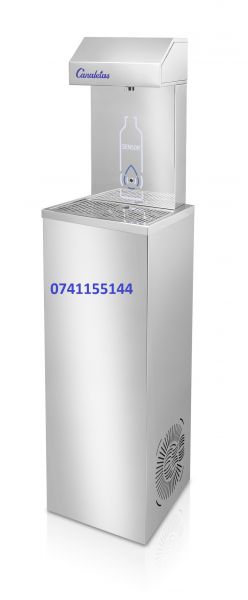 Capacitate mare de răcire pentru a umple sticlele și a elimina utilizarea de pahare de plastic. Placa superioară plată permite sticlelor să stea în poziție corectă. Robinet complet integrat în zona de distribuire. Jet de apă ascuns pentru protecție igienică optimă. Pedală/pedală mare și robustă din oțel inoxidabil Senzor pentru detectarea și iluminarea flacoanelor. Șuruburi allen rezistente la vandal. Din motive de siguranță, placa superioară nu poate fi scoasă. Cantitatea de ieșire a apei este limitată în timp pentru siguranță. Temperatura apei reci este ușor de reglat (termostat).