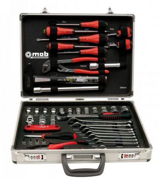 contine : - chei combinate 8-9-10-11-12-13-14-15-17-19 mm; - surubelnite locas cu crestatura 0.8x4x100 - 1x5,5x125 - 1,2x6,5x150; - surubelnita scurta locas cu crestatura 1x5,5x38 mm; - surubelnite Phillips - PH1x100 – PH2x125; 9122 - surubelnita scurta Phillips PH2x38; - set de 7 chei locas hexagonal 2-2,5-3-4-5-6-8 mm; - cleste combinat 180 mm bimat; - cleste reglabil pentru tevi A240; - ciocan 400 gr. cu coada carbon; - antrenor simplu cu maner 1/4"; - capete chei tubulare 1/4" cu bit Torx T10-T15-T20-T25; - antrenor cu clichet reversibil 1/2"; - intermediar cardanic 1/2"; - prelungitoare 125 mm - 250 mm 1/2" - capete chei tubulare 1/2" 8-9-10-11-12-13-14-15-17-19-22-24 mm; - capete tubulare de bujii 1/2" 19-21 mm